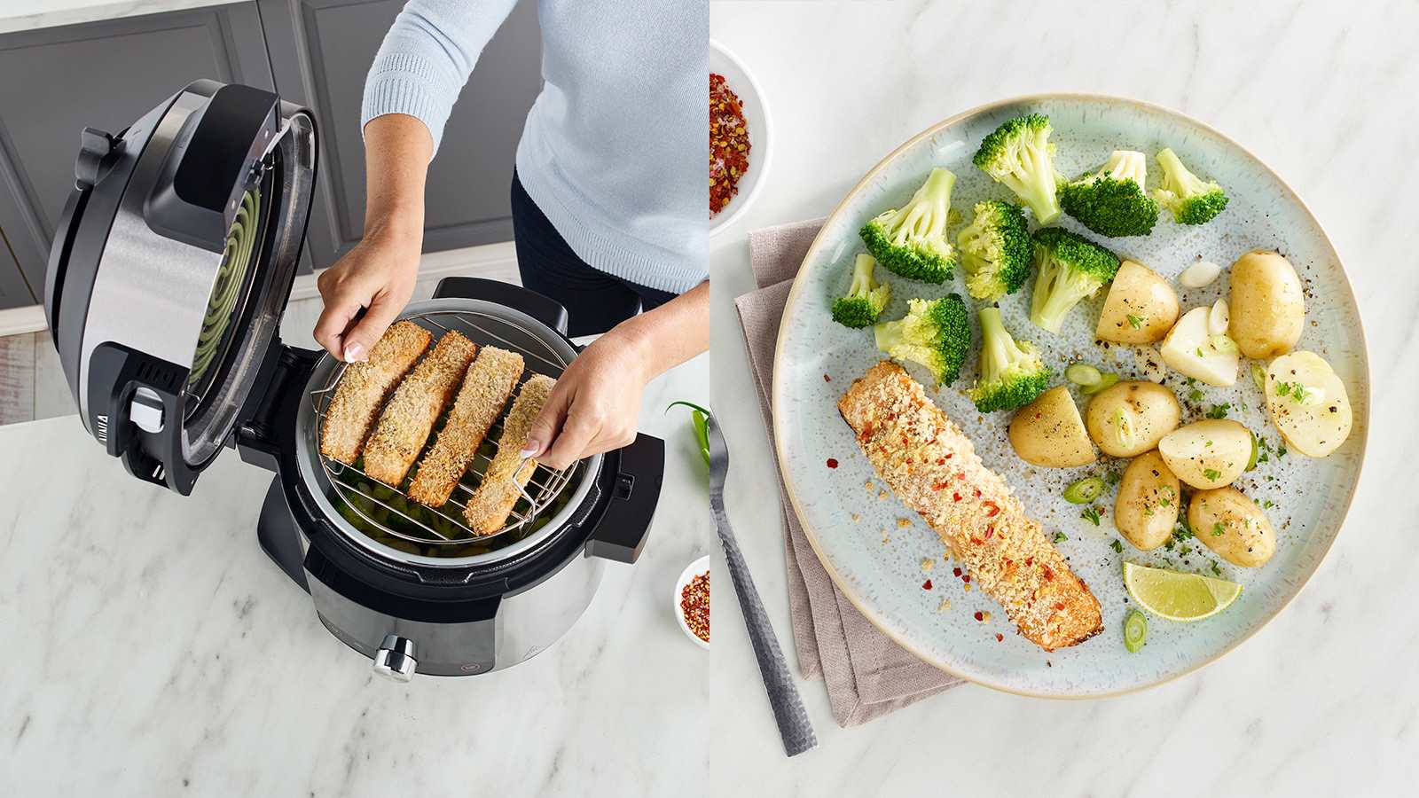Använd SmartLid-reglaget för att enkelt växla Pressure Cook (Tryckkoka), Air Fry (Luftfritera) och Combi-Steam (Kombiånga). Locket känner av vilken funktion du använder.